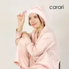 お風呂上りに被るだけ!ドライヤーの時間を大幅に短縮してくれる「carari吸水ヘアターバン」水分を素早く吸水してくれるので、ゆっくりスキンケアをしたり、子育て中の忙しい時にもオススメ!【驚きの吸水量】水に触れた瞬間、サッと吸水してくれます。その吸水量はなんと綿タオルの約3.3倍!マイクロファイバー繊維の毛細管現象によって、水分を素早く吸収します【抜群の速乾性】マイクロファイバーは、1本1本が放射線状の三角断面形状で無数の隙間を持っています。通気性に優れた繊維なので、高い速乾性を発揮します。洗濯物の乾きにくい時期にも快適にお使いいただけます【やさしい肌触り】通常織りあがったタオルは両面ともパイル状になっているため、引っかかりやすい。carariのタオルは表面を刈り取っているため、引っかかりにくく、上質で滑らかな肌触りに仕上げています