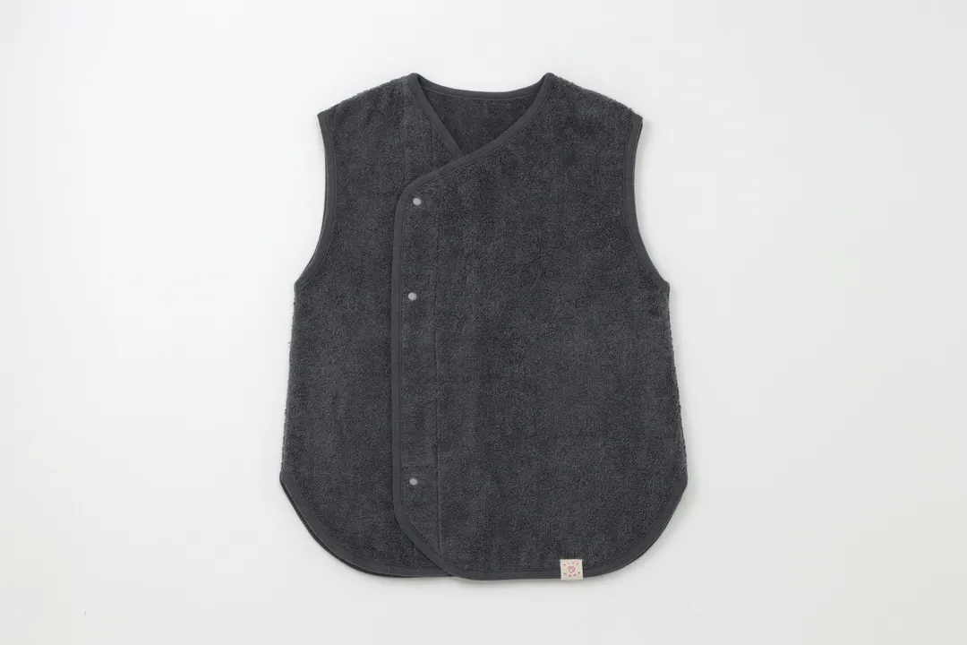 tinymame(タイニーマメ)は、愛媛県今治市のテキスタイルメーカー・ 渡辺パイル発の、ベビー&キッズ向けブランドです。 素材には良質なオーガニックコットンを100%使用。瀬戸内の豊かな自然をモチーフにした完全オリジナルのテキスタイルを自社工場で織っています。 タオルはもちろん、小さな子どものいる毎日に欠かせないアイテムを展開しています。 とっておきのふわふわベスト。長くお使いいただけるゆったりとしたサイズ感で、ベビーのスリーパーやキッズのベストとしておすすめです。 ●feel柄に込めた思い May it add a touch of happiness to your day. これであなたの一日が、幸せな触り心地になりますように。 ●feel柄のモチーフ なめらかでふんわり、シンプルでモダンな佇まい。ずっと触れて素材を味わいたくなるようなシリーズ。