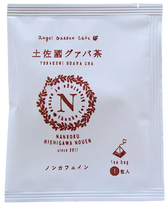 1包入り グァバ茶 2g×1包 【原材料】 有機グァバ葉(高知県産)100%   「南国にしがわ農園」では、南国市の有機自家農園で農薬や肥料、除草剤など使用せず、なるべく自然に近い環境に努力し、カエルやテントウムシなど多種多様な生物や植物が自然のままに息づく空間を大切に在来種グアバ果樹を2011年より栽培しています。 \自家焙煎の美味しいグアバ茶/ 地球最後の秘境アマゾン流域が原産といわれているグアバは、日照時間が日本でも有数の高知県で1978年から品種改良される事なく大切に栽培されてきました。糖尿病や高血圧症の漢方薬として重宝し、実を食す以外に葉も機能性に富んだお茶として長く愛飲されてきました。 ・ありそうでなかった“美味しいグアバ茶” ノンカフェイン 高知大学の協力のもと焙煎条件の研究を重ね、グアバ葉特有の青臭さを解消し毎日続けられる爽やかな味わいの美味しいグアバ茶に仕上げました。オーガニック志向の方や、ダイエットや、血糖値、血圧を気にされる方に好評です。お湯を注ぐだけで手軽にお召し上がりいただけます。やかんや鍋で1包を煮出すと2L抽出できます。夏季は冷たく冷やして美味しくお召し上がりいただけます。 ・高知県や高知大学の協力で確かな機能性データと認定を取得 高知大学等での試験により市販グアバやトクホ飲料に比べポリフェノール含量が高く、糖質と脂質の吸収抑制の活性が高いことを検証し日本農芸化学会で発表しています。 2014/5日本農芸化学会中国四国支部第39回講演会 2015/3日本農芸化学会2015年度大会 安全安心だけでなく確かな検証データでみなさまの健康と美容を応援します。 【農福連携×6次産業化】 障がい者就労支援事業所としての認可を受け、産官学・農福連携で、土作り種選びから栽培、加工、卸・販売までの6次産業化(農林水産省「総合化事業化計画」)の認定を受けています。 今後も、豊富な資源がない地域の小さい会社でも自社の強みを活かし、心豊かで幸せな日本の未来モデル、農福連携(障がい者雇用)を基本に、新規就農による地域活性、有機栽培のさらなる発展に取り組み奮闘してまいります。私たちが丁寧に栽培しました「土佐國グァバ茶」を多くの方に知って頂き、みなさまのご健康にお役立ていただければ幸いです。 製品のお申込が直接、障がい者への支援となり社会貢献となります。 グアバを大地に植え、自らの手で育て活用し人と地球環境をもっと豊かなものに変えていく使命を農福連携で実現していきます。 ※自家農園に有機JAS認証取得2013年9月