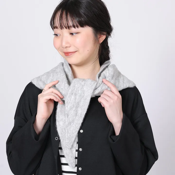 ショールとスカーフ、どちらの要素も兼ね揃えた三角シルエットは、山の向きを前後にするだけで様々なコーディネートをお楽しみ頂けます。 アルパカ混紡素材のため、寒い日でも暖かさをキープ、滑らかな肌触りが心地よい一枚です。 シルエットになぞって施した三角の編み柄と優しく控えめな北欧カラーがマッチしたデザイン。 コーディネートが締まらない時や印象を変えたい時にお洒落なアクセントを演出できます。 アルパカには滑らかな手触りと美しい自然な光沢があります。繊維の中心が空洞になっており、あたたかい空気をため込むことができます。そのため、放湿性と保温性にすぐれてます。また非常に丈夫で、毛玉ができにくいのも特徴です。こちらの製品は合成繊維との混合糸を使用していますので、品質表示をご確認の上お手入れしてください。 この製品は、日焼け、汗や水に濡れた場合の摩擦により、他の物への色移りや変色する場合がありますのでご注意ください。素材の特性上、毛羽立ちやピリングが生じることがあります。また、水洗いにより縮み、色落ち、毛羽立ちなどが生じ、風合いが変わる事があります。洗濯の際は、ネットに入れて押し洗いし、他の物と一緒に洗わないでください。蛍光増白剤・漂白剤入りの洗剤は使用しないでください。長時間水に浸けておいたり、濡れたまま放置しないでください。タンブラー乾燥は避け、自然乾燥してください。