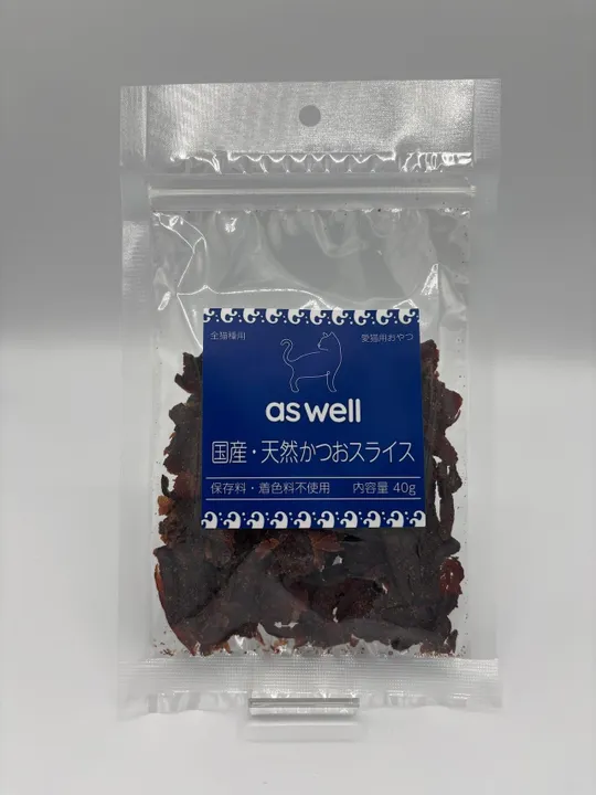 天然かつおスライス 「ペットは家族の一員。だからこそ、健康的な食事を届けたい。」 天然かつおスライスは、新鮮な国産かつおを使用し、愛猫の食事に最適な無添加・無着色の自然なおやつです。大切なペットに、至福のひとときを提供します! ・無添加・無着色:化学添加物を一切使わず、かつお本来の味と栄養をしっかりと引き出しています。 ・良質なかつお:国内の提携先から直仕入れた新鮮なかつおを使用し、安心して与えられる品質です。 愛する家族、ペットに特別なおやつをお届けします。ぜひお試しください! ※本商品は天然素材を使用しているため、スライスの形や大きさにばらつきがございます。品質や味には一切問題ございませんので、安心してご利用ください。 なお、小さめのスライスは食べやすく、粉状になった部分はいつものフードにふりかけていただくことで、香りUP! ※写真にて形状の一例をご確認いただけます。 ※無添加・無着色。素材本来の風味をお楽しみください。 <原材料名> 天然かつお <原産国> 日本 <販売者> B.I.S株式会社 <内容量> 40g <保存方法> ●直射日光や高温多湿の場所をさけて保存してください。●開封後は必ず封をして冷蔵庫で保存し、賞味期限にかかわらず早めに与えてください。 <成分分析値> 粗タンパク質 67.0%以上、粗脂肪 5.0%以上、粗繊維 3.0%以下、粗灰分 10.0%以下、 水分 18.0%以下、エネルギー(100g当たり)324kcal <給与量目安> 1日の給与量、成猫5g〜10gを健康状態や年齢、運動量を考慮して1日2回〜3回に分けてお与えください。猫の大きさ、体調に合わせて小さく切ってお与えください。 <ご注意> ●本品は愛猫用おやつです。他に流用しないでください。 ●生後6ヶ月未満の幼猫には与えないでください。 ●子供が愛猫に与える時は安全のため、大人が監視して与えてください。 ●愛猫の食べ方や習性によっては、のどに詰まらせることがありますので、観察しながら与えてください。 ●また新鮮な水も一緒にお与えください。 ●本品は、色、形に若干の違いがありますが、素材の違いによるものですのでご心配はありません。 ●品質保持のための脱酸素剤は食べられません。 ●お子様、ペットのふれない所に保管してください。