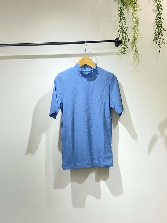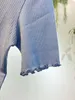 衿口、袖口はメローフリルを施し、大人かわいい仕様に。 タイトなシルエットで重ね着のインにも使いやすいアイテムです。 コットンの強撚糸と捲縮性のあるポリエステルを交編したテレコ素材。 生地表面のしぼ感・縮み感が特徴的な生地です。従来の薄手のリブ組織よりは、 ポリエステルと交編することで物性面でも優れた素材となっております。