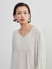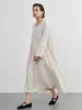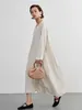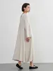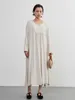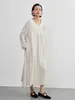 KNXO405-足さばきが良い・リネンMIX長袖ワンピース・飾りボタンギャザーロング丈 FREE/WHITE