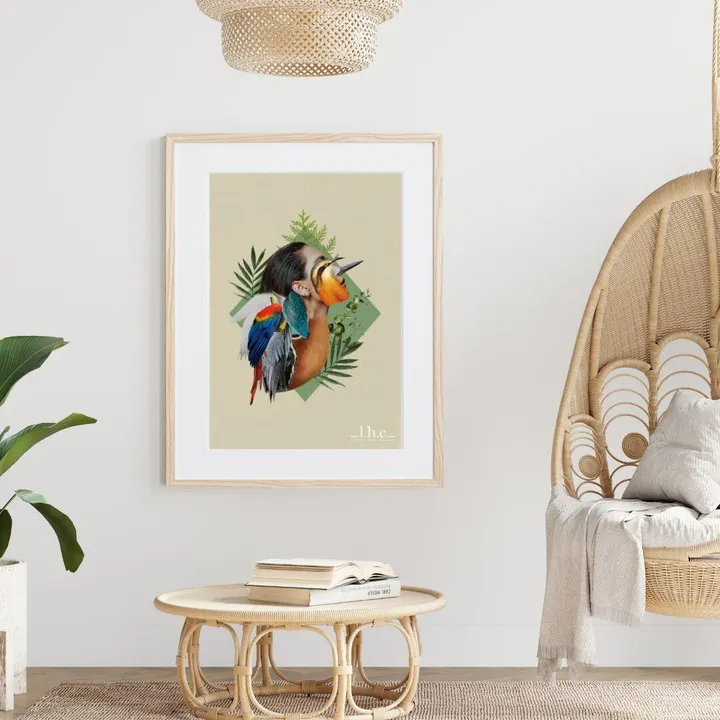 【現代アートポスター】南国 鳥 オウム 女性 おしゃれ 写真コラージュ A2(L) フレームセット:無垢 56.1×74.3cm