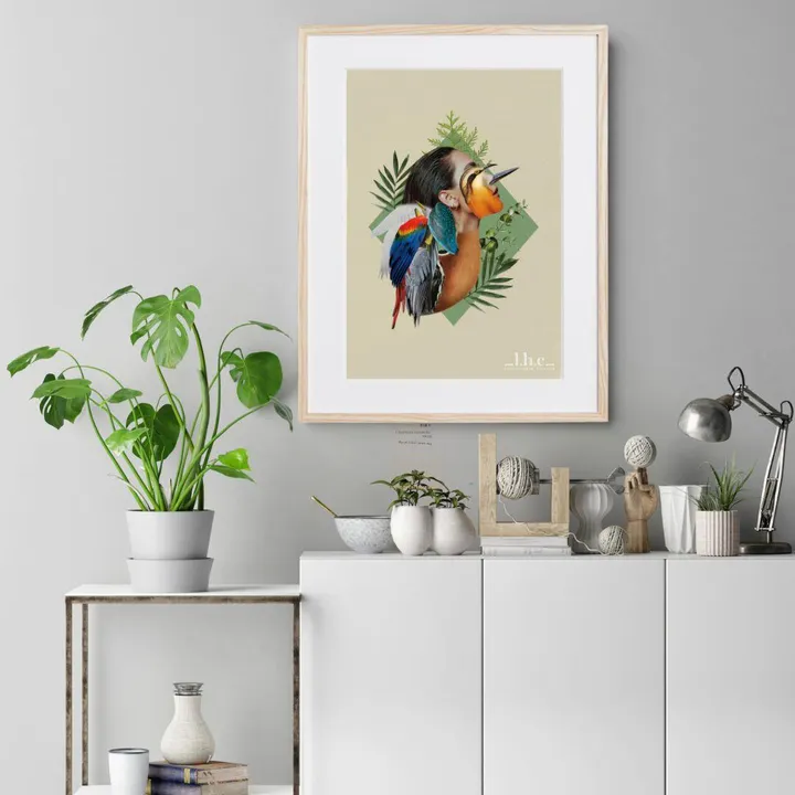 【現代アートポスター】南国 鳥 オウム 女性 おしゃれ 写真コラージュ A3(M) フレームセット:無垢 41.0×52.5cm