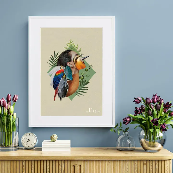 【現代アートポスター】南国 鳥 オウム 女性 おしゃれ 写真コラージュ A3(M) フレームセット:白 40.0×51.5cm