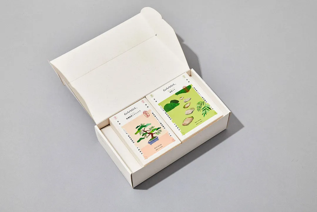 annonのオリジナルギフトボックス。注:中身は入っていません。また、ギフトボックスのみのご注文はご遠慮ください。 粉末茶3種類(玉川合組煎茶、特選煎茶トウベットウ、浅煎りほうじ茶)、ラテ2種類(抹茶ラテ、ほうじ茶ラテ)から 2種類を選び、詰め合わせできます。 仕切りが3種類(①粉末茶×粉末茶、②粉末茶×ラテ、③ラテ×ラテ)あり、バリエーションからお好きな仕切りをお選びいただけます。 ギフトボックス・仕切りとともに緑の留めゴム、薄紙(カラぺ)、ロゴシールが付属されます。