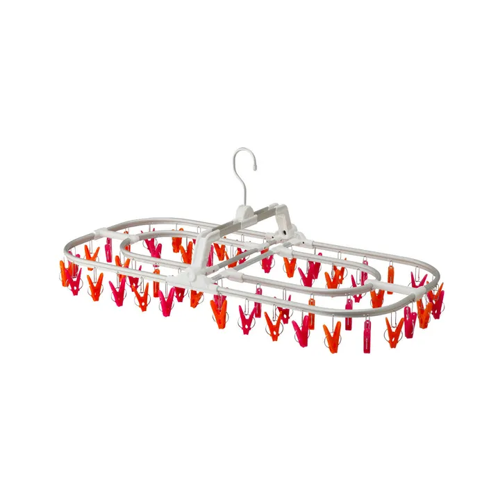 ●谷折り式●たっぷり干せる52ピンチのこだわり機能ハンガー、収納時も絡みにくい●収納時にフックが曲げられる便利な回転アルミフック●フックが自立するので高いところに掛けやすい●二重に配置されたピンチで、隠し干しOK●ねじれやたわみに強いリブ付きのアルミフレーム、ピンチ取付け部も金属製(アルミ製リブ+金属製リング)で頑丈●取り替え用ピンチをワンタッチで取り付けできる(工業所有権取得済)を採用