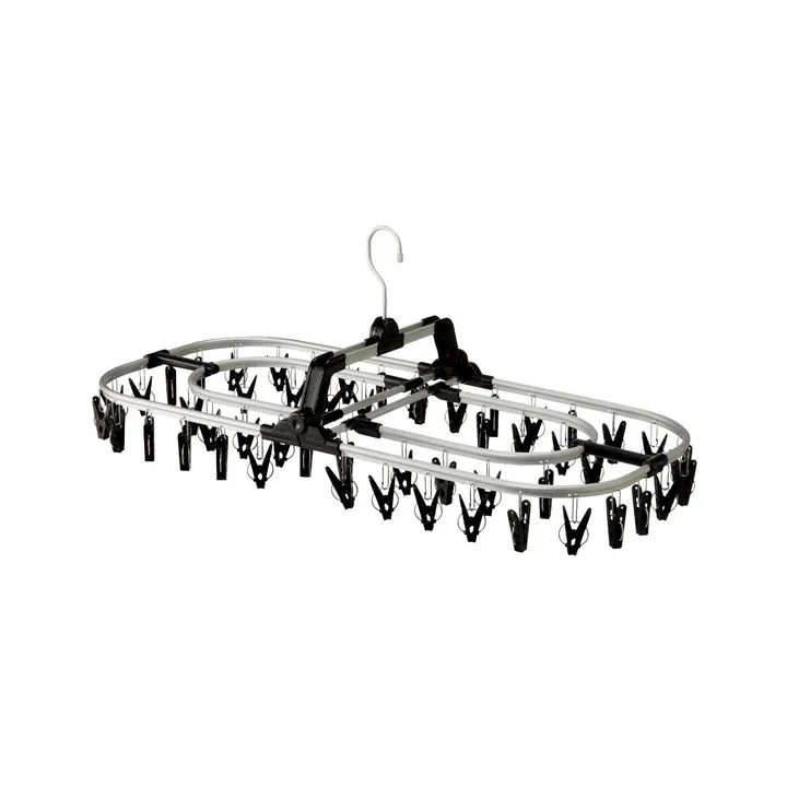 ●谷折り式●たっぷり干せる52ピンチのこだわり機能ハンガー、収納時も絡みにくい●収納時にフックが曲げられる便利な回転アルミフック●フックが自立するので高いところに掛けやすい●二重に配置されたピンチで、隠し干しOK●ねじれやたわみに強いリブ付きのアルミフレーム、ピンチ取付け部も金属製(アルミ製リブ+金属製リング)で頑丈●取り替え用ピンチをワンタッチで取り付けできる(工業所有権取得済)を採用