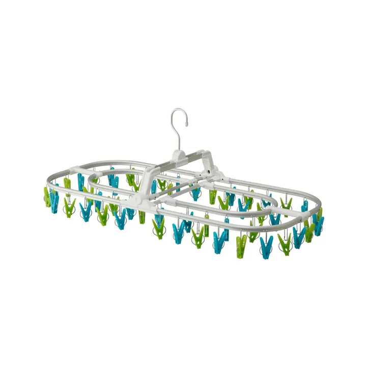 ●谷折り式●たっぷり干せる52ピンチのこだわり機能ハンガー、収納時も絡みにくい●収納時にフックが曲げられる便利な回転アルミフック●フックが自立するので高いところに掛けやすい●二重に配置されたピンチで、隠し干しOK●ねじれやたわみに強いリブ付きのアルミフレーム、ピンチ取付け部も金属製(アルミ製リブ+金属製リング)で頑丈●取り替え用ピンチをワンタッチで取り付けできる(工業所有権取得済)を採用