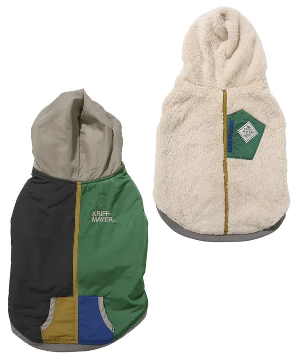 《KRIFF MAYER 秋冬アイテム「DOGひっくりベスト」》 KRIFFMAYER人気のひっくりシリーズに、ついに犬服が登場! ボアアウターって可愛いけど散歩中や公園遊びで、草やゴミがいっぱいついちゃう・・・ そんな時にはタフタ面を表にし、カフェなどおしゃれにおでかけを楽しむ時にはボア面を表にするなど場面によって使い分けられる万能アウターです! ボアを内側にすると暖かさもよりアップするので防寒にも最適!タフタを内側にすると滑りがいいので重ね着がしやすいです。 ワンポイントロゴ刺繍やピスネーム、配色感も裏表で変えているので1枚で2度楽しめるのが魅力! デザインだけでなく着脱させやすいという点にも拘り、右腕を通して面ファスナーをとめるだけの簡単仕様を実現させ わんぱくなわんちゃんにもさっと着せてあげられるオーナー様にも愛犬にも嬉しい実用性抜群な1枚に。 他にないドッグウェアで他のわんちゃんと差別化しちゃおう! ※ボア面を内側にすると暖かい分少しサイズ感が小さくなります。 ※従来のXLサイズがXXLサイズ表記になり新しいXLサイズにリニューアルしています。 ※ハーネス穴はございません。 ※アイテムによってサイズ感が異なる為、数値をよくお確かめください。