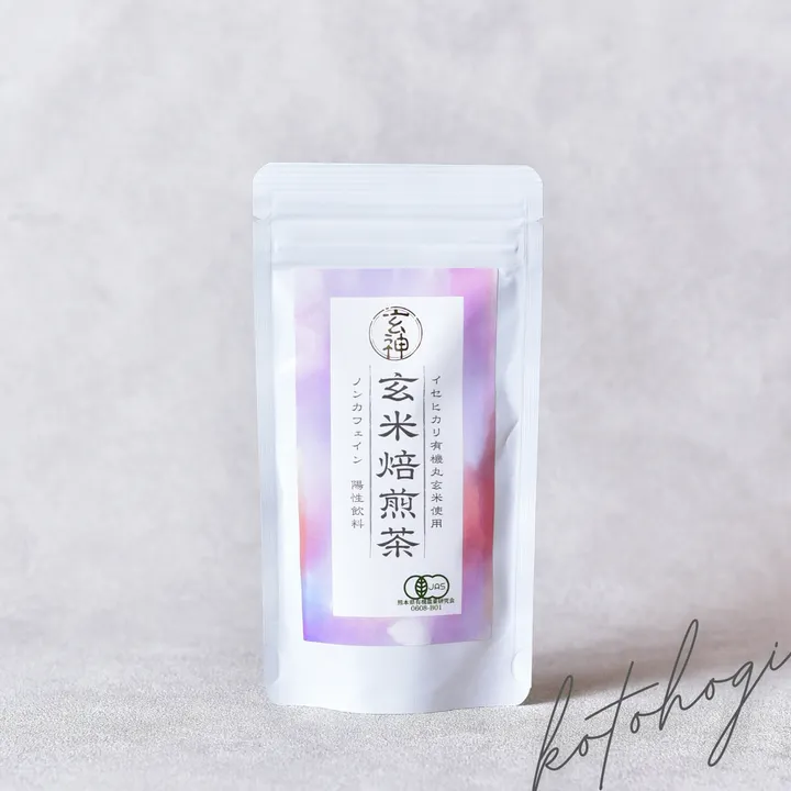 〜心に沁みる、お米の飲みもの〜 玄米焙煎茶(110g)イセヒカリ有機丸玄米使用 寿ぎの玄米焙煎茶は、イセヒカリ有機丸玄米のみをじっくり焙煎した陽性ノンカフェイン飲料です。 焙煎することにより栄養価が凝縮、飲むだけで玄米の栄養をたっぷり摂ることができます。 カカオのような香ばしく芳醇な香りと、お米の豊かな甘みを余すことなくご堪能ください。 ・・・ 焙煎玄米とは、玄米をじっくり焙煎して炭化したもの。 古代日本や中国において、「玄神」「玄心」と呼ばれ、薬膳茶として親しまれてきました。 玄米は、完全栄養食と言われ、40種類以上の栄養素を保有しています。 中でもビタミンB1、ビタミンB6、食物繊維、マグネシウム、カルシウム、ミネラルなどの他に、強い抗酸化力をもつファイトケミカルも多く含まれています。 血流をよくするビタミンE、代謝アップのビタミンBが豊富なため、体を芯からあたためてくれます。 〜特徴〜 ・ノンカフェインなのでいつでも気軽に飲める ・焙煎による「陽性飲料」のため体をじんわりあたためる ・炭化によりデトックス効果UP ・ポリフェノールは玄米の15倍、食物繊維は4倍以上に 〜玄米ポリフェノールの効果〜 ・自律神経を整えて体調・疲労・睡眠改善 ・肌の調子を整える ・血中抗酸化作用UP!肝臓を守る ・ナチュラルキラー細胞の活性化、抗酸化作用、コレステロール低下、脳機能改善作用など、効能が山ほど! 〜飲み方〜 1.やかんに水と焙煎玄米を入れ沸かす。 2.沸騰したら弱火にして20〜30分炊く。 煮出し終わった玄米は、空炒りしてすり鉢で粉にしふりかけにしたり、甘く炊いて佃煮にしていただくこともできます。土に返して堆肥として活用することも可能です。