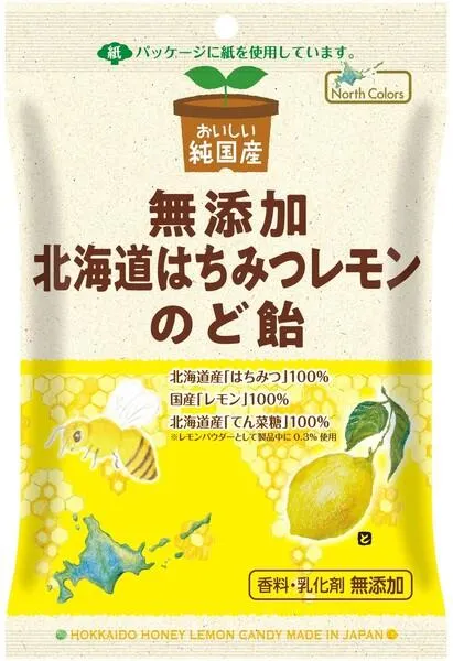 希少な北海道産のはちみつと、国産レモンをミックスしました。 はちみつ味ベースの甘い味わいの中に、ほんのりとレモンの爽やかさが加わりました。 香料と乳化剤が無添加のやさしい特別なのど飴です。