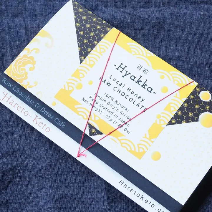 華やかで爽やか、優しい甘みの百花蜜が香る、チョコレートバー”百花”。 カシューナッツを加えてミルキーなお味に仕上げた、乳製品不使用のカカオ60%ミルクローチョコレートです。 彦根・鳥居本にてニホンミツバチを増やすための保護活動を行なっている「はちの宿とりいもと」さんから分けていただいた生ハチミツをたっぷりと使用しております。 蜂の負担にならない量のみを採蜜した、数量限定の貴重なはちみつです。 ※蜂蜜の売上は保護活動費に充てられています。 ※ハチミツ以外の甘味料として、チョコレートバー1枚あたりアガベシロップを2.5gのみ使用しております。 ローチョコレートとは ハレトケトの【ローチョコレートは生のオーガニックカカオを使用】しており、通常の焙煎されたカカオから作られるチョコレートよりも、【栄養価に優れている】と言われています。 【ポリフェノールを中心としたカカオの健康成分をたっぷりと摂ることができる】と思います。 ハレトケトで使用しているアリバ種カカオはエクアドルでしか育たない流通量2%未満の希少な固有種です。 世界的に高い評価を得ているカミーノベルデ農園から定温コンテナで直送された高品質なカカオ (生カカオ)を使用しております。