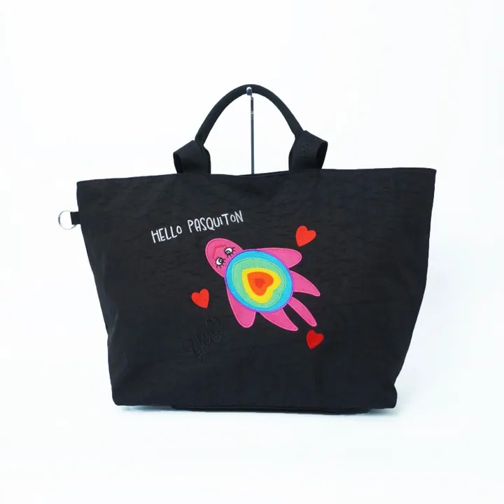 【商品説明】アーティストYUのパスキートンフレンズの刺繍がとてもキュートです。 ▲お取り扱いの注意 本製品は濃色、刺繍糸の色落ちすることがあります 洗濯は単独で洗って下さい。 〔サイズ詳細〕 高さ 37㎝ 横幅〔上部〕60㎝ 横幅〔下部〕44㎝ マチ 18㎝ ハンドルの高さ 15.5センチ ショルダーの高さ 36㎝ 〔素材〕 ポリエステル100% made in china 旅先でも可愛いバッグを持ちたい、そんなあなたにおすすめのトラベルbag。軽くて丈夫なので、旅行にも日常にもぴったりです。pasquitonキャラクターの刺繍があしらわれたデザインは、きっとたくさんの人の目を引きます。 特に、このバッグの素材は洗えるのが嬉しいポイント。旅行先で汚れが気になっても、帰ってすぐに洗えばいつでも清潔に使えます。また、コンパクトなので旅先での機内持ち込みにもオススメです。 このトラベルbagを持って旅に出かけると、一気に気分も上がります。普段使いでも可愛く持てるので、ぜひ一つ持っておくと便利です。
