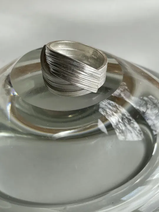 タイのチェンマイにて直接仕入れをしたカレンシルバーアクセサリーです。 山ほどあるリングの中からセレクトしてきました。 スッキリとしたデザインですが、立体感により程よいアクセントになります。 身につけると洗練された印象になります。男性にもおすすめです。 重さ:9g 1番長さのある箇所で高さ1.5cm ・・・ カレンシルバーは、タイやミャンマーの山間部に住むカレン族の人々によって、丁寧に手作りされた高純度のシルバー製品です。 純度の高いシルバーならではの独特の柔らかい色味や光沢感、肌触りが感じられます。 ※こちらは工業製品ではなく人の手で作られている商品です。 よって小傷や歪になっている箇所があります。 ※カレンシルバーは通常のシルバーアクセサリーに比べ銀の含有量が高く、やや柔らかいのが特徴です。 細い箇所や繊細な箇所には、強い力が加わると変形する可能性があります。ご注意ください。