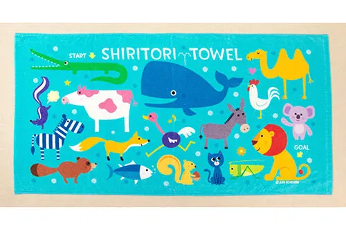 【絵本ナビオリジナルグッズシリーズ企画!】 絵本の世界を楽しめる♪新企画「あそべる絵本マルチタオル」シリーズ第二弾! 絵本作品や絵本作家さんによる描き下ろしの絵が、大きなマルチタオルになるという企画が2018年7月にスタートしました。 第二弾は、絵本『あーん』(えほんの杜)や絵本『もいもい』(ディスカヴァー・トゥエンティーワン)など、たくさんの人気絵本作品を出されているイラストレーター 市原淳さんの描き下ろしデザインです! 約60×120cmのタオルにプリントされた、カラフルでかわいい生きものたち。「SHIRITORI TOWEL」と書かれ、その下には「START」と「GOAL」の文字が。 そう、今回のタオルはしりとり遊びができちゃうんです! しかもこのしりとり、ちょっとやそっとじゃゴールできません。 なぜなら「むずかしいしりとりタオル」だから! 生きものたちは、しりとり順には並んでいません。矢印などのヒントもなく、ひっかけ問題もありますよ。親子やお友達同士で考えておしゃべりして、ゴールまで楽しんでくださいね! 【遊び方のススメ】 ◆ステップ1:まずは生きものの名前を当てっこしてみよう♪全部わかるかな? ◆ステップ2:しりとりに挑戦してみよう!ちょっと難しいから、親子で遊んでみてね♪ ≪ヒント≫ ・生きものは、しりとりの順番通りに並んでないよ ・「ら」が付く生きものが2匹いるよ ・お魚はちょっと難しいよ。何の種類のお魚かな?考えてみてね! ・ハートやお花、お星さんはどこかな?見つけてみてね! ▼姉妹で仲良く、しりとりスタート! ▼2歳の妹さんはまだしりとりはできないけれど、「ライオン~!」と知ってる生きものを見つけて教えてくれました。 ▼「やったー!ゴールできた!」うれしそうなニコニコ笑顔がとってもキュート! ▼元気いっぱいの男の子。タオルの周りをアクロバットに移動しながら、しりとり中! ▼「次はここかな?」親子でおしゃべりしながら楽しんでます♪ 大きめサイズなので、使い方さまざま。プレゼントにもぴったりの便利なアイテムです。 ●お昼寝タオルやバスタオルとして ●プールや海など、水遊びのアウトドアに ●ベビーカーでのお散歩やひざかけに ●おもちゃ箱などの収納ケースやソファーに掛けて、インテリアとして 【作者 市原淳さんからのメッセージ】 最初はしりとりができなくても成長に合わせてどんどんわかってくると思うので、長く使ってもらえたらうれしいです! 市原淳さんとパチリ! 【付 属】市原淳さんからのメッセージリーフット付。(しりとりの答えも書いてあります)