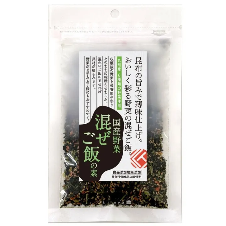 九州産の6種類の野菜をそのまま乾燥して細かいチップ状にしました。温かいご飯に混ぜ込んでお使いください。 かつお風味の胡麻と昆布で味付け、塩は薄味に仕上げています。 内容量:30g 原材料名:野菜チップ(野菜(大根葉・小松菜・高菜・キャベツ・ほうれん草・にんじん)(国産)、ブドウ糖)、いりごま、食塩、昆布粒、かつお節、砂糖、酵母エキス、しょうゆ(小麦・大豆を含む) 賞味期限:180日 栄養成分表示:(100gあたり)エネルギー/351kcal、たんぱく質/13.8g、脂質/9.6g、炭水化物/52.4g、食塩相当量/14.2g アレルギー:小麦、大豆、ごま お召し上がり方 ♦温かいご飯に混ぜ込んでお使いください(1袋で約2合分) ♦もちろんおにぎりにも ♦おかゆに混ぜて離乳食に ♦インスタント食品に加えて簡単に野菜の栄養をプラス ~九州産野菜のこだわり~ 6種類の国産野菜(大根葉、小松菜、高菜、キャベツ、ほうれん草、にんじん)は、契約農家より入荷後すぐに洗浄しボイル後、半日以上低温乾燥で仕上げました。低温乾燥はFD(フリーズドライ)と比べて生のような食感や風味、香りを味わえます。また、青物などの特有の臭いやアクがなく、野菜が苦手な人にも食べやすく仕上がっております。