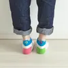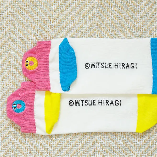 『お?かお!』『ころりん・ぽい!』(ほるぷ出版)などが大人気の絵本作家ひらぎみつえさん。「あかちゃんがよろこぶしかけえほん」シリーズはユニークな表紙の絵のインパクトだけでなく、あかちゃんの小さな指でも気持ち良く動かせるしかけと、その動きのおもしろさで、2016年の発売以来シリーズ全27作(2024年12月現在)累計300万部を突破! まさに親子で楽しめるあかちゃん向けしかけ絵本の新定番として定着しています。 絵本ナビでは、シリーズの中でも人気の4冊『お?かお!』『ころりん・ぱ!』『ころりん・ぽい!』『ぴったん・こ!』を「絵本ナビオリジナルグッズ」として制作。絵本の持つユーモラスな雰囲気と、しかけを動かした時のワクワク感を生かしながら、とびっきり愛らしい商品の数々が誕生しました。 こちらはレディースソックス。くりくり目玉のついたわっかの「ころりん」に指をのばし、くねくねした道を走らせるしかけ絵本『ころりん・ぱ!』。そのころりんの可愛い刺繍がワンポイントになったレディースソックスが完成しました! 『ころりん・ぱ!』の絵本をイメージするピンク、ブルー、グリーンの3色を基調に、左右それぞれ違う色と表情の「ころりん」が刺繍されています。また、つま先とも違う色になっている遊び心満載のポップなデザイン。 好きな色を選んでも、3色まとめて購入しても! キッズサイズもありますので、親子で揃えて履いて楽しんでください。絵本と一緒にギフトにもおすすめです。