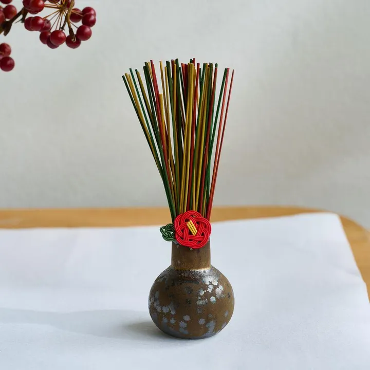 国内で生産される陶磁器のおよそ半数が美濃焼といわれている焼物の産地で作られた小さな花瓶とセットになったい草のお飾りです。椿の水引とい草を花瓶に入れて、お正月飾りとしてお楽しみいただけます。椿の水引にはヘアピンがセットされており、お正月のヘアアレンジや帯留めにもお使いいただけます。赤・黄・緑と色鮮やかない草は、1色だけ使ったり全て混ぜて使ったりとお好みでお使いください。お正月飾りとして飾った後は、い草が持っている消臭機能やリラックス効果などを年中お楽しみいただけます。ご自宅の玄関やリビング、トイレなど様々なシーンでご使用いただけます。●い草のお飾りは<a href="https://www.superdelivery.com/p/do/dpsl/190793/?word=%E3%81%84%E8%8D%89%E3%81%AE%E3%81%8A%E9%A3%BE%E3%82%8A">コチラ</a>生産地:福岡県三潴郡*デザインボックス入り<div>い草の学名 Juncus には「結ぶ」という意味があるそうです。結ぶという言葉には、繋げる・まとめる・創る・固める・締めるのように様々な意味があり、人との関係をむすぶ、契りを結ぶといったご縁や心をむすぶという意味でも使われます。い草はそんな縁起の良い意味を持った草です。また、い草には空気をきれいにする効果や消臭効果、調湿効果があり、さらに香りにはリラクゼーション効果があります。【インテリア雑貨】【消臭】【リラックス】【イグサ】【い草】【ハレの日】【出産】【成人式】【ひな祭り】【七五三】【正月】【正月飾り】【水引】【水引アクセサリー】【ヘアピン】【帯留め】【花瓶】【フラワーベース】【贈答品/ギフト】【い草のお飾り】【プレゼントボックス】【X2】Interior Goods, Deodorant, Relaxation, Igusa, Special Occasion, Birth, Coming of Age, Hina Festival, Shichi-Go-San, New Year, New Year Decoration, Mizuhiki, Mizuhiki Accessories, Hairpin, Obi Clip, Vase, Flower Vase, Gift, Igusa Decoration</div>