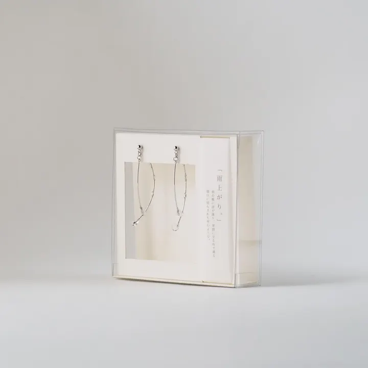 「雨上がり。」イヤリングorピアス 【image】 花鳥風月の『風』シリーズ。 …景色や空気感をモチーフにしたものです。 夜のうちに雨が止み、電線やガードレールに滴る雨水をイメージしました。 レジンで水滴を演出し、つやを出すコーティングをしているので ガラスのような透明感です。 【scene】 スタンダードな樹脂イヤリングタイプは、 金具が本体から抜けることがあります。 金具を引っ張っての着脱は避けてください。 樹脂イヤリングの場合は、前後アシンメトリーに使えます。 とてもシンプルなので、ビジネスシーンにも◎ また、耳たぶの厚めの方の場合には、付け根が広がることで金具部分が交差する可能性もあります。 しかしながら、それはそれで素敵な気がします。 【attention】 ・イヤリング or ピアス金具 ・カラー(シルバー、ゴールド) ※こちらは「オリジナルBOX入り」の価格となります。
