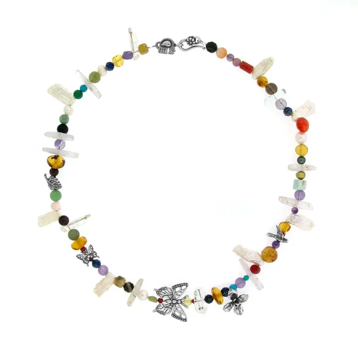 様々な天然石と花と蝶、鳥をかたどったシルバーチャームを組み合わせたネックレス