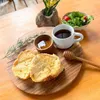 無垢チーク材のワンプレートトレイ(丸タイプLサイズ)が入荷しました☆コップを乗せる部分もありまるでオシャレなカフェです♪チーク材は古来より、高級家具や、ヨットなどの船舶の甲板材などで重宝された、水にも強く、耐久性の高い素材になります。天然の木材の温かみたっぷりで、使い心地や手触り、使い込んだ手への馴染みも良く、末永くご愛用して頂けます。ウレタンやラッカー塗装はしておらず、オリーブオイル仕上げになっておりますので、体にも優しく、自然の艶で高級感があります。チーク材の独特な香りがする場合がございますが、洗浄して頂き、自然乾燥していただければ徐々に無くなります。量産品とは違う、手にして頂いた時の手触りの違いにご満足いただけると思います!全体サイズ:約横幅27cm× 奥行27cm× 厚さ2cm コップ部分7.5cm 材質:チーク無垢材 ※天然素材でフルハンドメイドでの製品となり多少の色やサイズに誤差が生じる事もございます。またPCディスプレイの性質上実際の色と異なって見える場合がございますので予めご了承ください。