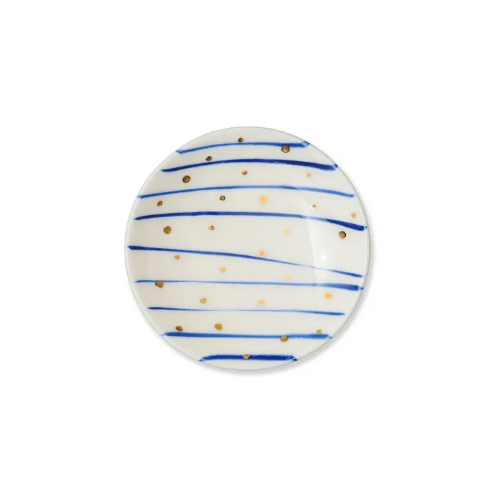 水から生まれる生命力や儚さを、色鮮やかな群青色ときらめく金彩で表しました。 来客時やお祝いの席などハレやかな場に合う、華やかな仕上がりの器です。 金群青(きんぐんじょう) 素地の白さを引き立たせ為、コバルトの青の鮮やかさにこだわった手描きの染付豆皿です。 上絵の金彩を重ねることで華やかさをプラスしています。 水を吸いいきいきと潤いのある花の生命力をあらわした”花に水”。 雨の雫と静かにひびく雨音の儚さを描いた”雫に雨音”。 清流のゆったりとした流れと水面にはじける光の粒を切り取った”川に光”。 花、雨、川..外に広がる風景に想いを馳せながら、心地よい時間を共に過ごす器になればと描きました。