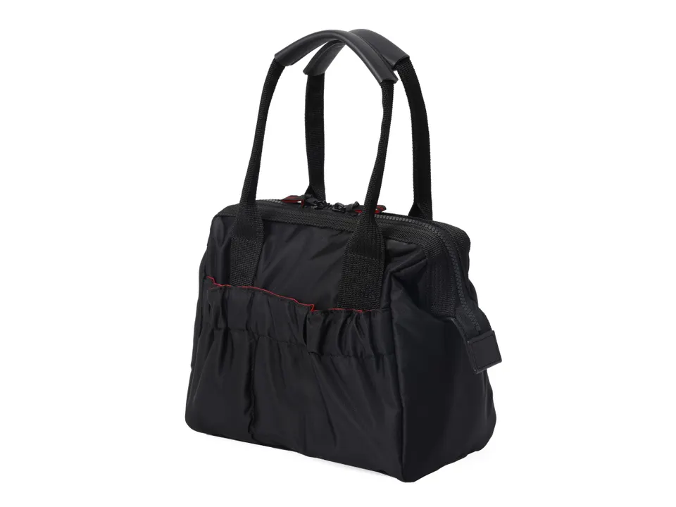 スクエア型の口元をしっかりキープするクラスプ(口金)が特徴の、このシリーズ。もともとはメイクアップ・アーティスト用の携帯用メイク道具入れ。底面は平らで広く、ファスナーを開いた状態でもしっかり自立します。 バッグ内部は四方にポケットやホルダーが配置されていて、コスメや小物をスッキリ収納できます。別売りのコンテナを使えば、メイクボックスとしても使用可能です。ポケットは全面タイプが2つと、太いホルダーと細いホルダーがそれぞれ4つ。アイテムごとに細かな収納ができます。 メイクボックスとしてはもちろん、ハンドバッグとして、デイリーに使用することも可能です。バッグ内には四方にポケットがあるので、メイク道具と日用品との入れ分けも可能。大きなポケットには長財布もきちんと収まります。