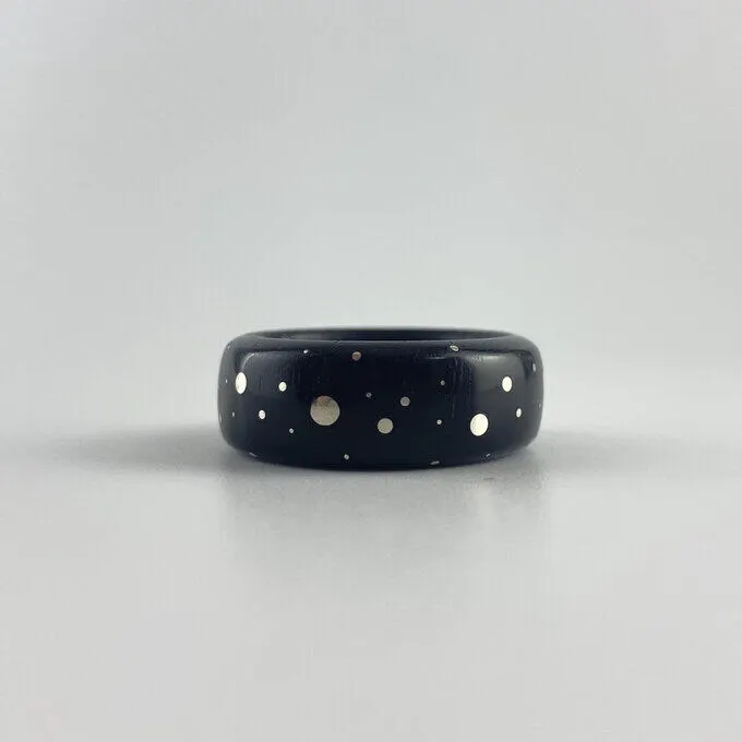 素材:アフリカンブラックウッド(グラナディラ)、silver925(象嵌細工) 参考商品サイズ:17号 ○MPINGO〈ムピンゴ〉 木管楽器などに使われる「アフリカン・ブラックウッド」は、準絶滅危惧種に指定されている希少銘木材です。楽器製作時に生じる規格外部品を再活用して、彫刻家の繊細な技巧により、高級感のある商品へとアップサイクルしました。音楽の持つ素晴らしさと世界を平和にする力、そして地球上の環境問題やそれを支える方々の取り組みを、ジュエリーという形でお届けしていきます。