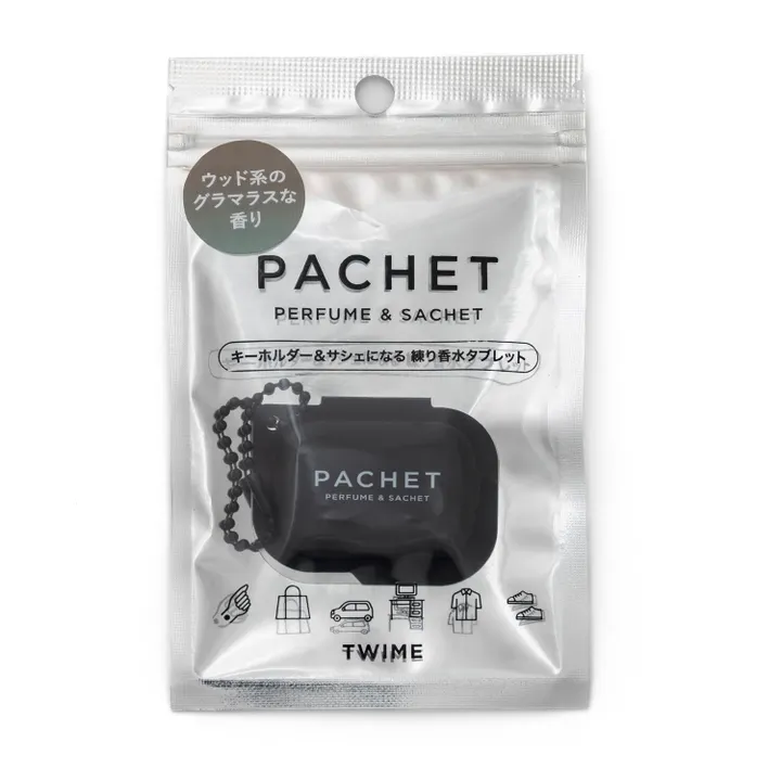PACHETは、練香水(Perfume)とサシェ(Sachet)が融合したプロダクト。タブレット型でキーホルダーにもなるから、持ち運びも◎です。