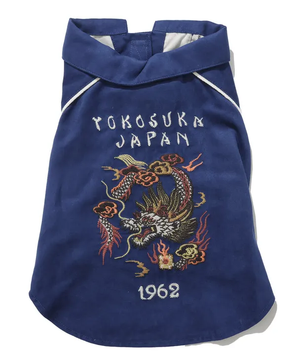 《KRIFF MAYER 秋冬アイテム「DOGスーベニア刺繍JK」》 スエードタッチ素材のスーベニア刺繍ジャケット。 ヴィンテージのスカジャンからサンプリングした龍のグラフィックがインパクトのある一枚。 飾りパイピングテープがアクセントになっています。 伸縮性がないアイテムですが、面ファスナーで前が全て開くので着脱簡単! 他にないドッグウェアで他のわんちゃんと差別化しちゃおう! ※伸縮性のないアイテムです。 ※ハーネス穴はございません。 ※従来のXLサイズがXXLサイズ表記になり新しいXLサイズにリニューアルしています。 ※アイテムによってサイズ感が異なる為、数値をよくお確かめください。