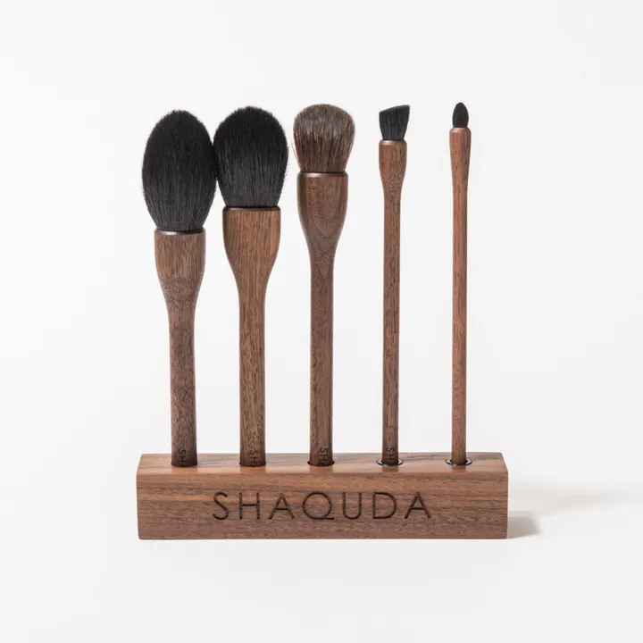 山羊毛・PBTを使ったベーシックな5本セット。ブラシを美しく直立収納できるブラシスタンドとともにギフトボックスにお詰めしました。 極上の肌あたりを大切な方への贈りものに。 内容 801 クラシカルフェイスブラッシュ 筆の原点に回帰した穂先のフォルムが秀逸なクラシカルフェイスブラッシュ。パウダーを美しくのせるフィニッシング用や、ナチュラルに仕上げるファンデーション用、さらにチーク用やシェイディング用にも使える、オールマイティな1本です。 用途:フィニッシング/ファンデーション・チーク・シェイディング 803 ブルーミングフェイスブラッシュ 肌を華やかに魅せる、ほのかにシャープな形状のブルーミングフェイスブラッシュ。柔らかくコシのある山羊毛は、粉含みがよく、チークの量を調整しやすいので、ほほにふんわりあでやかな彩りを添えます。 用途:チーク/フィニッシング・ファンデーション 810 ミネラルファンデーションブラッシュ 整ったラウンド型で、穂先がしっかりと密集したファンデーションブラッシュ。ルースタイプのファンデーションも、固形タイプのファンデーションも、しっかりとお肌にのせることができるので、ナチュラルな仕上がりが望めます。 用途:ファンデーション/フィニッシング・チーク 821 タッチアップブラッシュ 密集した穂先と、フラット型のシェイプがしっかりお肌に密着するタッチアップブラッシュ。ポニーと人工毛が絶妙にブレンドされた張りのある穂先で、気になる部分をカバーします。カラーをしっかりのせるアイメイクにも最適な1本です。 用途:コンシーラー/アイシャドウ・ハイライト 824 スモーキーアイブラッシュ アイシャドウのスモーキーなエッジカラーをのせるのに最適なスモーキーアイブラッシュ。繊細な穂先がアイラインから深みのある自然なグラデーションを演出します。アイブロウカラーをほのかにぼかしたり、自然になじませる際にも活用できます。 用途:アイシャドウ/アイブロウ DST3 ブラッシュディスプレイスタンド5 ブラッシュシリーズUBUを美しく直立収納できる5本用スタンド。ブラシと同じく天然木のウォールナット素材を使用し、統一感のある洗練されたデザインに仕上げています。簡単なスペーサーの調整で太さの異なるブラシも収納可能です。