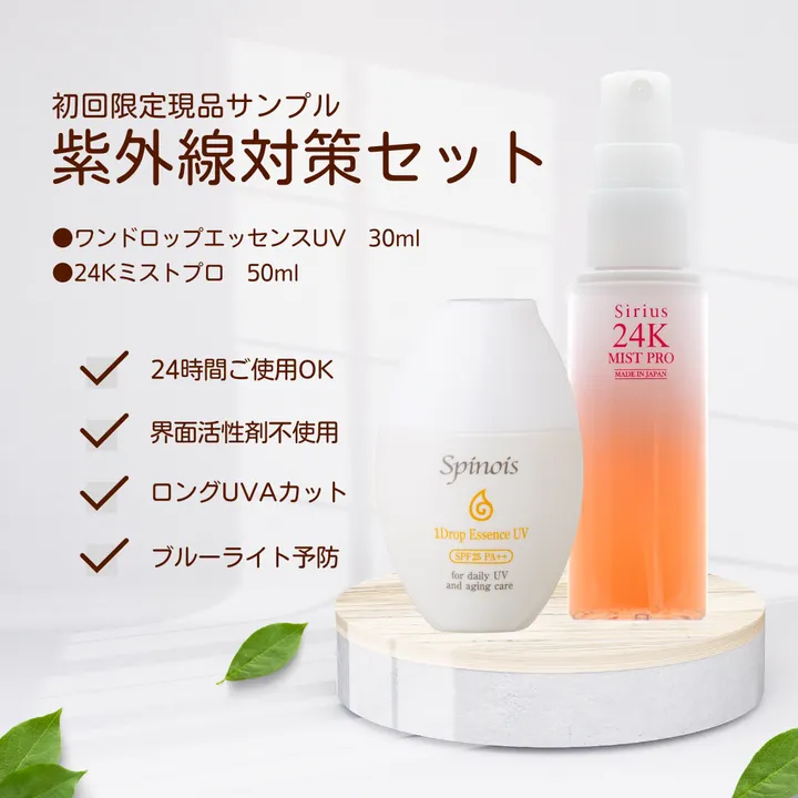★初回限定★現品サンプル★ 【紫外線対策セット内容】 ・ワンドロップエッセンスUV:1個 ・24Kミストプロ:1個 ●ワンドロップエッセンスUV 美容液として使える日焼け止め【SPF25/PA++】 「紫外線からお肌を守る」「お肌の機能を損なわない」の両方を叶えた日やけ止め用美容液。 美容液に日焼け止め効果を付与しているため、使用したまま就寝できる肌にやさしい処方で作られています。 独自技術により、紫外線吸着剤が肌に触れることが無いよう、 完全にシルクでコーティングし、カプセル化した上で配合しました。 紫外線吸着剤の肌に対する影響はありませんので、お肌が敏感な方でも大丈夫! 年齢や性別、肌質を問わずお使いいただけるオールシーズンアイテムです。 また、ワンドロップエッセンスUVは、石けんで落とすことが可能です。 落とすときの肌への負担も考慮しているため、専用クレンジング剤が必要になる界面活性剤及びシリコン系成分は一切使用しておりません。 ●24Kミストプロ 紫外線やブルーライトによる老化などの影響から肌を守ってくれる日中用保湿ミスト 昼間の肌をとりまく環境は過酷です。 紫外線や大気の汚れ、花粉、汗など、外界からの刺激にさらされ続けているからです。 近年では、スマホやパソコンの画面から放出されるブルーライトによる、細胞への悪影響が憑念されています。 「24Kミストプロ」は、高い保湿効果に加え、抗炎症・酸化による老化予防・ブルーライト対策まで網羅。 朝のお手入れの効果が薄れる時間帯から夜のお手入れの時間まで、 肌トラブルの原因を未然に防ぎながら、積極的なケアで過酷な昼間の肌を守り、育みます。 〇理想的なケアとビルベリーの実力 刺激を受けてしまった肌は、時間を置かずその場で対処することが理想的。 小さな炎症はさまざまな肌トラブルを誘因し、酸化は肌の老化を止めてくれません。 最新の研究により、 ブルーライトが細胞の健全な発育を妨げることが分かってきました。 今回、高濃度で配合したビルベリーには、ブルーライトから細胞を保護する働きが確認されているだけでなく、 抗炎症・酸化による老化予防・美白・保湿など肌に有効な成分が多く含まれています。 過酷な時間帯を乗り切るアイテムとして 「24Kミストプロ」を使った新しい”昼間のお手入れ”をおすすめいたします。 乾燥や紫外線が気になる時、PCに向かい続けて一息ついた時、 メイクや日焼け止めの上からそのままプッシュして、肌に馴染ませてください。 ▼界面活性剤不使用 合成の界面活性剤は一切使用していません。 ▼香料不使用 製品にいろどりを与える香料ですが、香料に含まれる溶剤や添加物には 刺激の原因となる成分が含まれることがありますので使用を控えました。 ▼油分不使用 油分と水分の保湿バランスを天然植物エキスで調整することを基本に考えた成分構成。 油分不使用で確かな潤いと肌荒れ改善が期待できます。