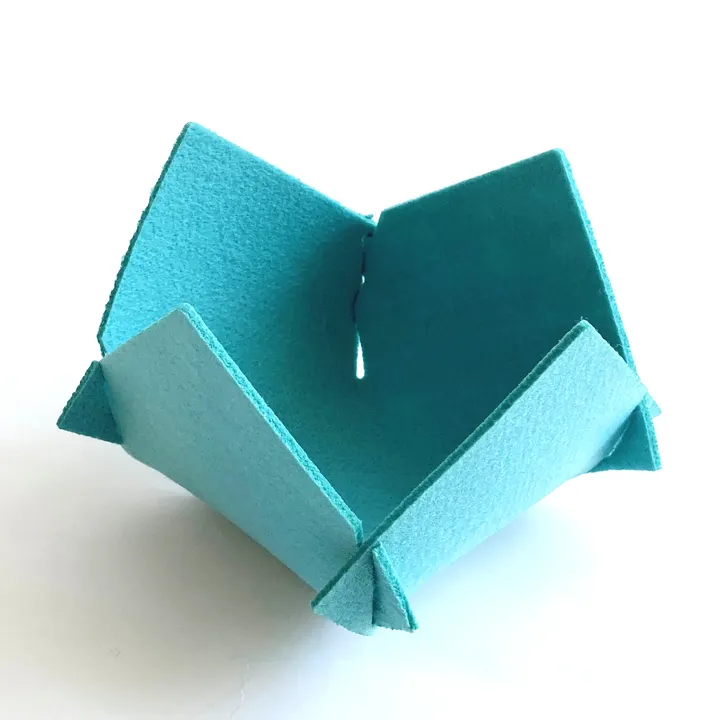 小物入れ〉に続く〈小物入れW〉をデザインしました。正方形をベースに4ヶ所の切り込みを差込むことによりできるちょっと個性的な小物入れです。フェルト素材はモノにも人にも優しく、クリップ、ピン等の文具からアクセサリー、キャンディー等入れるもののアイデアが広がります。使い方はデスクトップ、テーブルウェア、リビングの小物入れとして、またフラットにして本の間にはさみお出かけに持ち運べば使用したいところで、大事なものの小物入れとして活躍しそうです。もちろんウォッシャブルフェルトを採用しており、汚れた時は洗濯可能です。ビビットなカラーはプレゼントにもおすすめです。