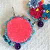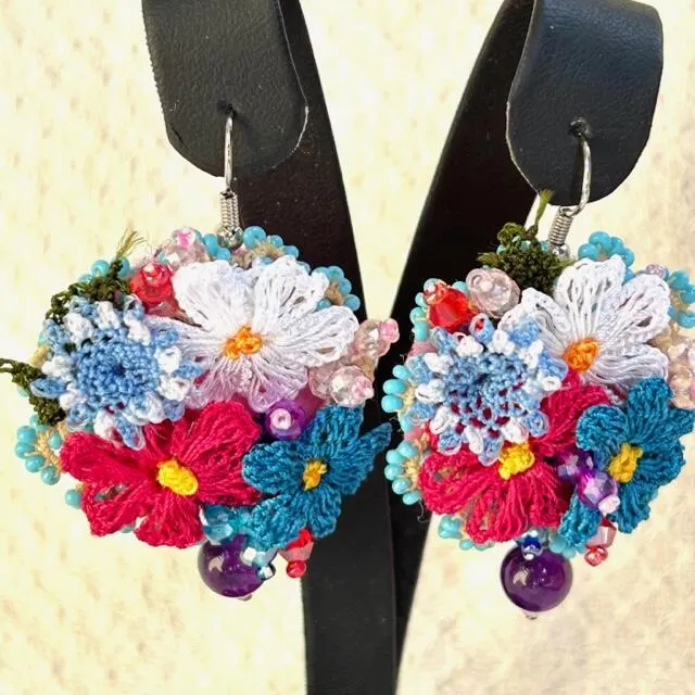 サイズ:約φ4cm フック部分含む最長約6.5cm 色鮮やかなお花のモチーフに様々なビーズなどをちりばめたピアス 耳元で華やかでキュートにお顔周りを彩ります。 トルコの伝統手芸 oya 起源は不明らしいのですが、大昔は 魚を捕る網がすでにその技法だったといわれています。 イスラムの女性たちは髪を隠すためにスカーフを覆います。 はるか昔に使われていたその技法が、イスラムの文化圏でスカーフの縁どりに 装飾されおしゃれを楽しむようになったようです。 オヤはトルコ語で縁飾りを意味します。 技法や手法によって呼び名が変わるそうです。 針を使う技法、かぎ針を使う技法 または、ビーズや石などを編みこんでいる手法など。