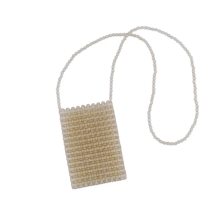 落ち着いた色合いの透明ビーズがキラキラと輝く、コーデのポイントとして楽しめるショルダー型のビーズポーチ。 スマホがすっぽりと入るサイズ感で、リップなどの小物も空いたスペースに収納可能。 使用しているラウンドカット型アクリルビーズは、ガラスビーズに比べて軽くて丈夫なのが特徴。複数のカット面が光を反射するため、キラキラとした輝きを楽しめます。 また、汚れてしまった場合は、柔らかい布で優しく拭き取ることで、いつまでも美しい輝きを保つことができます。 【ファッション雑貨】【鞄/カバン】【スマホショルダー】