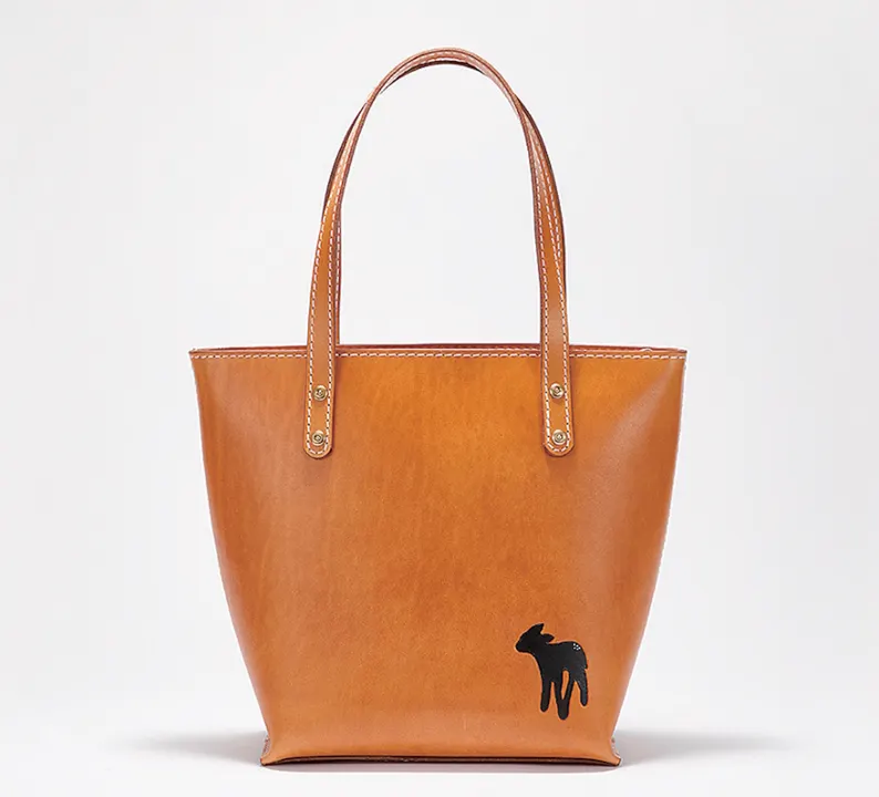上質レザーの柔らかさが際立つバケツ型トートバッグ。 明るいオークカラーに小鹿のワンポイントが大人可愛いデザイン。デイリー使いに最適。