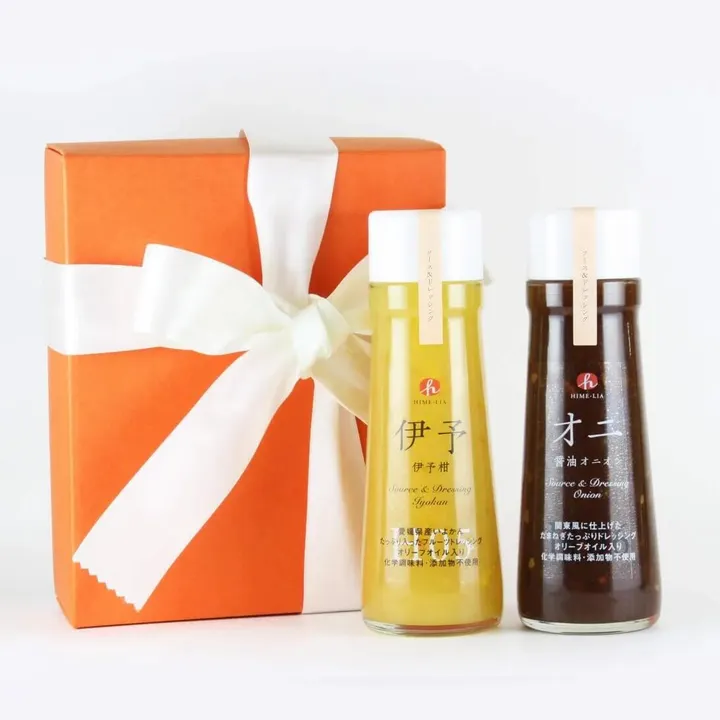 素材と製法にこだわったHIME-LIAドレッシング。伊予柑と醤油オニオンの2本セットです。 甘いものが苦手な男性に。おしゃれな女性へのプレゼントに。 健康を願い父の日に。いつまでも素敵でと願う母の日に。 季節のご挨拶やお礼、内祝いなど贈り物にお使いください。 【セット内容】 🔶醤油オニオン HIME-LIAドレッシング【常温】200ml×1本 たっぷりのたまねぎと、愛媛県産天然醸造醤油を使った醤油オニオン。 手作り・味・技・素材にとことんこだわったソース&ドレッシングです。 🔶伊予柑 HIME-LIAドレッシング【常温】 200ml×1本 愛媛県の限られた場所でしか収穫できない貴重な「越冬完熟伊予柑」を使っています。 米酢に1ヶ月漬け込んだ昆布酢に油・調味料にまでとことんっています。 甘めなのでお子様にもおすすめです。 サラダはもちろん、お鍋のつけダレ、唐揚げや生春巻きのソース、冷やっこなどにおすすめ