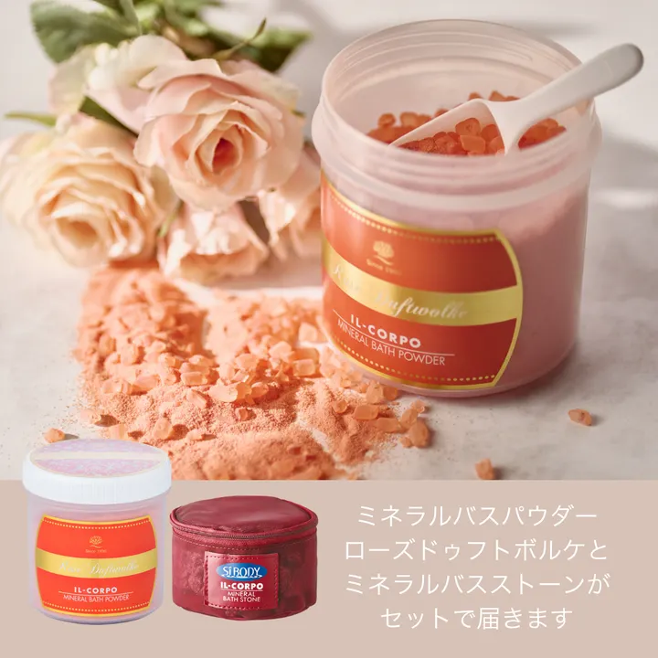 ※今週の在庫が僅少になっているため、いったん受注制限をしております。12月10日以降の納期で差し支えない場合のみ、個別確認いたしますのでお問い合わせください。 エステティックサロン・スパ・美容院・ネイルサロン・リラクゼーションサロン・クリニック、美容サロン、雑貨店等のお客様向けにご紹介しております。 「ミネラルバスパウダー600g+ミネラルバスストーン600g」のセット販売商品です。 ◆イルコルポの代名詞的存在 ! イルコルポ 深部温浴ミネラルケアについて お湯に溶けたミネラルは、ベールのようにして肌の表面を覆う特性があります。 その結果、入浴×ミネラルの相乗効果として、下記の3つの効果が期待できます。 ・体をじんわり深く温める お湯に溶けたミネラルは、肌の表面をそっと包み込み、体の熱を逃がさず温浴感を高めます。冷えやすい体も、芯からじんわりポカポカに。 ・肌をやさしく整える お湯に溶けたミネラルが肌を包み、バリアの働きをサポート。 刺激を受けやすく敏感な肌を守りつつ、うるおいやすこやかさをキープします。 ・心も体もゆるむリラックス ミネラルにより温浴効果が高まることで温かさが長く続き、体も心もゆるむひとときに。慌ただしい一日をリセットして、自分を大切にする時間へ。 これからの時期、「身体が冷える」「肌がかさかさする」「肌がくすんで見えてしまう」といった相談が増える時期。 温浴×セルフマッサージ×イルコルポで、温かさとうるおいをキープできる点もおすすめいただけますと、 お客様の興味をひきやすい商品ですので、ぜひご紹介ください。 ◆特にこんな方におすすめです お風呂で汗をかいて・・・ ・手軽にサウナ体験・岩盤浴体験をしたい ・スッキリしてゆっくり眠りたい ・じっくり温まりたい ・暑熱順化・夏バテ防止対策したい ・冷え対策をしたい ・本物志向なアロマの香りで癒されたい ・モデル、女優、美容家にも人気の商品を使いたい ◆ こんな時におすすめです ・エステ施術等の際のハンドバス・フットバスとして (※バスパウダーは200Lに対して20gです。3~10L程度の洗面器・バケツで利用の際は、加減をして溶かしていただけますと幸いです。 ※バスストーンは20分ほどお湯であたためてください。遠野産天然石は温めることで遠赤外線を放出します。) ・お客様への小売り販売として (一部の香りになりますがで小売り販売しやすい分包タイプ、200gサイズもご用意しています。) <概要> イルコルポのロングセラー商品で、沖縄県宮古島雪塩と海藻エキスを配合したバスパウダー(入浴剤)です。 保湿・整肌成分としてスクワラン・パパインを配合しており、うるおい逃がさず、お風呂上りはしっとりとした肌でお過ごしいただけます。香りもこだわり全9種類ご用意(2025.10.16現在)。 日々の喧騒を忘れて心身ゆったりとした気分になれるお風呂空間をご提供いたします。 <特長> 【POINT.1】ミネラルのヴェールでしっかり温まる!なのにうるおい逃がさない。 タラソテラピーにも着想を得て開発されている「ミネラルバスパウダー」は、沖縄県宮古島雪塩と海藻エキスを配合している点が一番のポイントです。 ミネラルヴェールのように肌をやさしく包み込むことで、入浴時の温かさを逃しにくい使用感が特長的な商品で、 InstagramやXをはじめとするSNSでも「滝汗」「発汗」といったワードとともに紹介されることの多い商品です。 半身浴やサウナなどでじっくり汗をかくのがお好きな方にご好評いただいております。 <ここが違う!> 沖縄・宮古島の碧く澄んだ海から生まれた「雪塩」は、まるで粉雪のように繊細で、柔らかな手触りが特徴の高純度ミネラルソルト。 一般的な塩づくりで取り除かれてしまう“ニガリ”を含め、マグネシウム・カルシウム・カリウムなど、海のミネラルを豊かに含有しているのが特徴的な海塩です。 (出典:株式会社宮古島の雪塩調べ) 【POINT.2】心と身体をリセット!深みと奥行きのある贅沢アロマ風呂。 バラの栄誉として殿堂入りを果たした「ローズドゥフトボルケ」をイメージした、フルーティでいてみずみずしく、まるで咲き誇るバラの庭に包まれるようなアロマ。 ローズ色の透き通ったお湯です。 【POINT.3】「Made in Japan」のみならず、「日本各地に息づく素材」にもこだわった商品です。 ミネラルバスパウダーをはじめ、SiBODYの商品は日本国内製造をしております。 また、商品開発においても、宮古島の雪塩をはじめ、ユズ、ヒノキ、クロモジと「日本各地に息づく自然の恵み」や、 そこに根付く「伝統的な素材」にも目を向けた商品づくりを心がけています。 ※ユズ、ヒノキ、クロモジはアロマコレクションとしてご用意しています。 <バスストーン> 岩手山の麓、遠野でのみ産出される天然石100%の繰り返し使える入浴剤。 遠野産天然石に含まれる角閃石は20分ほどお湯に沈めて温めると遠赤外線を放出。 手軽に岩盤浴気分を楽しんでいただけます。 ・香り:無臭 ・使用感:さめにくく