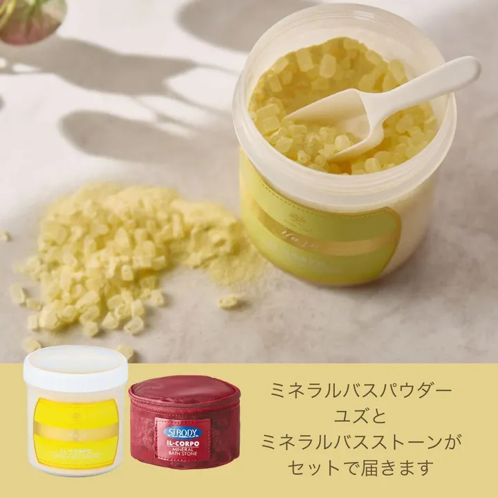 ※今週の在庫が僅少になっているため、いったん受注制限をしております。12月10日以降の納期で差し支えない場合のみ、個別確認いたしますのでお問い合わせください。 エステティックサロン・スパ・美容院・ネイルサロン・リラクゼーションサロン・クリニック、美容サロン、雑貨店等のお客様向けにご紹介しております。 「ミネラルバスパウダー600g+ミネラルバスストーン600g」のセット販売商品です。 ▼香りの組み合わせは自由!ミネラルバスパウダー600g 5個まとめて購入で【送料無料】 https://goooods.com/products/10e2ebfe-f76d-4ca1-ae07-c9dc28ac1803/27bbd003-7863-4ff6-96c7-c686d70794eb ▼ミネラルバスストーンのみ発注したい方はこちら 5個まとめて購入で【送料無料】 https://goooods.com/products/31e1c8a1-f44d-4f25-aecc-b956824eb5d3/f5a5fc0b-1598-4e19-bc7c-ea620386c3e4 ◆イルコルポの代名詞的存在 ! イルコルポ 深部温浴ミネラルケアについて お湯に溶けたミネラルは、ベールのようにして肌の表面を覆う特性があります。 その結果、入浴×ミネラルの相乗効果として、下記の3つの効果が期待できます。 ・体をじんわり深く温める お湯に溶けたミネラルは、肌の表面をそっと包み込み、体の熱を逃がさず温浴感を高めます。冷えやすい体も、芯からじんわりポカポカに。 ・肌をやさしく整える お湯に溶けたミネラルが肌を包み、バリアの働きをサポート。 刺激を受けやすく敏感な肌を守りつつ、うるおいやすこやかさをキープします。 ・心も体もゆるむリラックス ミネラルにより温浴効果が高まることで温かさが長く続き、体も心もゆるむひとときに。慌ただしい一日をリセットして、自分を大切にする時間へ。 これからの時期、「身体が冷える」「肌がかさかさする」「肌がくすんで見えてしまう」といった相談が増える時期。 温浴×セルフマッサージ×イルコルポで、温かさとうるおいをキープできる点もおすすめいただけますと、 お客様の興味をひきやすい商品ですので、ぜひご紹介ください。 ◆特にこんな方におすすめです お風呂で汗をかいて・・・ ・手軽にサウナ体験・岩盤浴体験をしたい ・スッキリしてゆっくり眠りたい ・じっくり温まりたい ・暑熱順化・夏バテ防止対策したい ・冷え対策をしたい ・本物志向なアロマの香りで癒されたい ・モデル、女優、美容家にも人気の商品を使いたい ◆ こんな時におすすめです ・エステ施術等の際のハンドバス・フットバスとして (※バスパウダーは200Lに対して20gです。3~10L程度の洗面器・バケツで利用の際は、加減をして溶かしていただけますと幸いです。 ※バスストーンは20分ほどお湯であたためてください。遠野産天然石は温めることで遠赤外線を放出します。) ・お客様への小売り販売として ミネラルバスパウダー <概要> イルコルポのロングセラー商品で、沖縄県宮古島雪塩と海藻エキスを配合したバスパウダー(入浴剤)です。 保湿・整肌成分としてスクワラン・パパインを配合しており、うるおい逃がさず、お風呂上りはしっとりとした肌でお過ごしいただけます。 また、香りもこだわり全9種類ご用意(2025.10.16現在)。 日々の喧騒を忘れて心身ゆったりとした気分になれるお風呂空間をご提供いたします。 <特長> 【POINT.1】ミネラルのヴェールでしっかり温まる!なのにうるおい逃がさない。 タラソテラピーにも着想を得て開発されている「ミネラルバスパウダー」は、沖縄県宮古島雪塩と海藻エキスを配合している点が一番のポイントです。 ミネラルヴェールのように肌をやさしく包み込むことで、入浴時の温かさを逃しにくい使用感が特長的な商品で、 InstagramやXをはじめとするSNSでも「滝汗」「発汗」といったワードとともに紹介されることの多い商品です。 半身浴やサウナなどでじっくり汗をかくのがお好きな方にご好評いただいております。 <ここが違う!> 沖縄・宮古島の碧く澄んだ海から生まれた「雪塩」は、まるで粉雪のように繊細で、柔らかな手触りが特徴の高純度ミネラルソルト。 一般的な塩づくりで取り除かれてしまう“ニガリ”を含め、マグネシウム・カルシウム・カリウムなど、海のミネラルを豊かに含有しているのが特徴的な海塩です。 (出典:株式会社宮古島の雪塩調べ) 【POINT.2】心と身体をリセット!深みと奥行きのある贅沢アロマ風呂。 冬の風物詩「柚子湯」を彷彿とさせる、柑橘の爽やかさと果皮の青々としたみずみずしさが広がる、やさしい香り。 黄色のにごり湯です。 【POINT.3】「Made in Japan」のみならず、「日本各地に息づく素材」にもこだわった商品です。 ミネラルバスパウダーをはじめ、SiBODYの商品は日本国内製造をしております。 また、商品開発においても、宮古島の雪塩をはじめ、ユズ、ヒノキ、クロモジと「日本各地に息づく自然の恵み」や、 そこに根付く「伝統的な素材」にも目を向けた商品づくりを心がけています。 ※ユズ、ヒノキ、クロモジはアロマコレクションとしてご用意しています。 <バスストーン> 岩手山の麓、遠野でのみ産出される