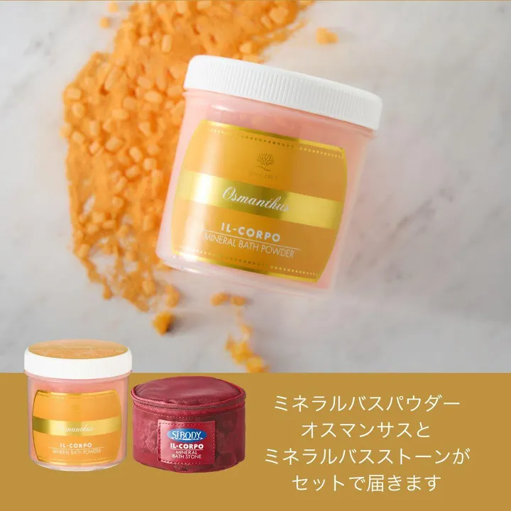 ※今週の在庫が僅少になっているため、いったん受注制限をしております。12月10日以降の納期で差し支えない場合のみ、個別確認いたしますのでお問い合わせください。 エステティックサロン・スパ・美容院・ネイルサロン・リラクゼーションサロン・クリニック、美容サロン、雑貨店等のお客様向けにご紹介しております。 「ミネラルバスパウダー600g+ミネラルバスストーン600g」のセット販売商品です。 ▼香りの組み合わせは自由!ミネラルバスパウダー600g 5個まとめて購入で【送料無料】 https://goooods.com/products/10e2ebfe-f76d-4ca1-ae07-c9dc28ac1803/27bbd003-7863-4ff6-96c7-c686d70794eb ▼ミネラルバスストーンのみ発注したい方はこちら 5個まとめて購入で【送料無料】 https://goooods.com/products/31e1c8a1-f44d-4f25-aecc-b956824eb5d3/f5a5fc0b-1598-4e19-bc7c-ea620386c3e4 ◆イルコルポの代名詞的存在 ! イルコルポ 深部温浴ミネラルケアについて お湯に溶けたミネラルは、ベールのようにして肌の表面を覆う特性があります。 その結果、入浴×ミネラルの相乗効果として、下記の3つの効果が期待できます。 ・体をじんわり深く温める お湯に溶けたミネラルは、肌の表面をそっと包み込み、体の熱を逃がさず温浴感を高めます。冷えやすい体も、芯からじんわりポカポカに。 ・肌をやさしく整える お湯に溶けたミネラルが肌を包み、バリアの働きをサポート。 刺激を受けやすく敏感な肌を守りつつ、うるおいやすこやかさをキープします。 ・心も体もゆるむリラックス ミネラルにより温浴効果が高まることで温かさが長く続き、体も心もゆるむひとときに。慌ただしい一日をリセットして、自分を大切にする時間へ。 これからの時期、「身体が冷える」「肌がかさかさする」「肌がくすんで見えてしまう」といった相談が増える時期。 温浴×セルフマッサージ×イルコルポで、温かさとうるおいをキープできる点もおすすめいただけますと、 お客様の興味をひきやすい商品ですので、ぜひご紹介ください。 ◆特にこんな方におすすめです お風呂で汗をかいて・・・ ・手軽にサウナ体験・岩盤浴体験をしたい ・スッキリしてゆっくり眠りたい ・じっくり温まりたい ・暑熱順化・夏バテ防止対策したい ・冷え対策をしたい ・本物志向なアロマの香りで癒されたい ・モデル、女優、美容家にも人気の商品を使いたい ◆ こんな時におすすめです ・エステ施術等の際のハンドバス・フットバスとして (※バスパウダーは200Lに対して20gです。3~10L程度の洗面器・バケツで利用の際は、加減をして溶かしていただけますと幸いです。 ※バスストーンは20分ほどお湯であたためてください。遠野産天然石は温めることで遠赤外線を放出します。) ・お客様への小売り販売として ミネラルバスパウダー <概要> イルコルポのロングセラー商品で、沖縄県宮古島雪塩と海藻エキスを配合したバスパウダー(入浴剤)です。 保湿・整肌成分としてスクワラン・パパインを配合しており、うるおい逃がさず、お風呂上りはしっとりとした肌でお過ごしいただけます。 また、香りもこだわり全9種類ご用意(2025.10.16現在)。 日々の喧騒を忘れて心身ゆったりとした気分になれるお風呂空間をご提供いたします。 <特長> 【POINT.1】ミネラルのヴェールでしっかり温まる!なのにうるおい逃がさない。 タラソテラピーにも着想を得て開発されている「ミネラルバスパウダー」は、沖縄県宮古島雪塩と海藻エキスを配合している点が一番のポイントです。 ミネラルヴェールのように肌をやさしく包み込むことで、入浴時の温かさを逃しにくい使用感が特長的な商品で、 InstagramやXをはじめとするSNSでも「滝汗」「発汗」といったワードとともに紹介されることの多い商品です。 半身浴やサウナなどでじっくり汗をかくのがお好きな方にご好評いただいております。 <ここが違う!> 沖縄・宮古島の碧く澄んだ海から生まれた「雪塩」は、まるで粉雪のように繊細で、柔らかな手触りが特徴の高純度ミネラルソルト。 一般的な塩づくりで取り除かれてしまう“ニガリ”を含め、マグネシウム・カルシウム・カリウムなど、海のミネラルを豊かに含有しているのが特徴的な海塩です。 (出典:株式会社宮古島の雪塩調べ) 【POINT.2】心と身体をリセット!深みと奥行きのある贅沢アロマ風呂。 新たに2025年秋新発売! 華やかな甘さにローズマリーやラベンダーなどのハーブが調和した、上質で洗練された金木犀の香りです。 オレンジ色のにごり湯です。 【POINT.3】「Made in Japan」のみならず、「日本各地に息づく素材」にもこだわった商品です。 ミネラルバスパウダーをはじめ、SiBODYの商品は日本国内製造をしております。 また、商品開発においても、宮古島の雪塩をはじめ、ユズ、ヒノキ、クロモジと「日本各地に息づく自然の恵み」や、 そこに根付く「伝統的な素材」にも目を向けた商品づくりを心がけています。 ※ユズ、ヒノキ、クロモジはアロマコレクションとしてご用意しています。 <バスストーン> 岩手山の麓、遠