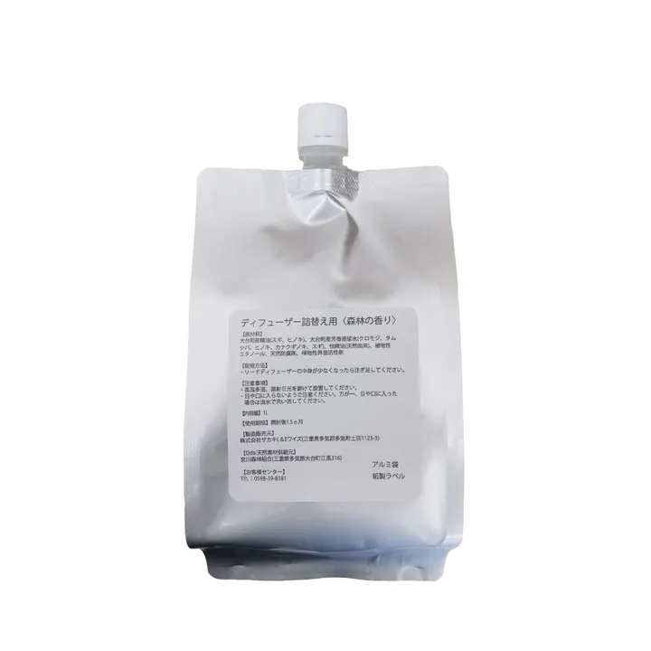 ディフューザー詰替用の業務用1Lタイプです。 ※こちらは店頭設置などされているディフューザーに詰め替えるための業務用商品で、一般販売不可ですのでご注意ください。 〈森林の香り〉 大台町産スギ、ヒノキの精油と他天然由来精油を加え、蒸留時に抽出される大台町産クロモジ、タムシバ、カナクギノキ、スギ、ヒノキの芳香蒸留水をベースにした天然香料のみでブレンドしました。 爽やかで奥ゆかしい森林の香りをイメージしています。 ※こちらの商品は「ディフューザー詰替用 森林の香り(微香タイプ)」とは別商品で香りも異なります。 ※「ディフューザー詰替用 森林の香り(微香タイプ)」に比べて香りの広がり方が強めのフレグランスです。 ※液体色が天然原料本来の色によって少し黄色がかっています。品質や香りなどに影響はなく問題ございません。 〈森林の香り(微香タイプ)〉 香り成分を全て大台町産の5種の樹木(クロモジ、タムシバ、ヒノキ、カナクギノキ、スギ)から抽出した精油と芳香蒸留水を使ってブレンドしました。 やさしくひろがる森の香りをお楽しみください。 ※こちらの商品は「ディフューザー詰替用 森林の香り」とは別商品で香りも異なります。 ※「ディフューザー詰替用 森林の香り」に比べてほのかで優しい香りがするフレグランスです。 ※液体色が天然原料本来の色によって少し白濁しています。品質や香りなどに影響はなく問題ございません。