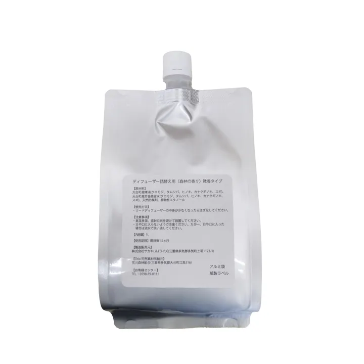 ディフューザー詰替用の業務用1Lタイプです。 ※こちらは店頭設置などされているディフューザーに詰め替えるための業務用商品で、一般販売不可ですのでご注意ください。 〈森林の香り〉 大台町産スギ、ヒノキの精油と他天然由来精油を加え、蒸留時に抽出される大台町産クロモジ、タムシバ、カナクギノキ、スギ、ヒノキの芳香蒸留水をベースにした天然香料のみでブレンドしました。 爽やかで奥ゆかしい森林の香りをイメージしています。 ※こちらの商品は「ディフューザー詰替用 森林の香り(微香タイプ)」とは別商品で香りも異なります。 ※「ディフューザー詰替用 森林の香り(微香タイプ)」に比べて香りの広がり方が強めのフレグランスです。 ※液体色が天然原料本来の色によって少し黄色がかっています。品質や香りなどに影響はなく問題ございません。 〈森林の香り(微香タイプ)〉 香り成分を全て大台町産の5種の樹木(クロモジ、タムシバ、ヒノキ、カナクギノキ、スギ)から抽出した精油と芳香蒸留水を使ってブレンドしました。 やさしくひろがる森の香りをお楽しみください。 ※こちらの商品は「ディフューザー詰替用 森林の香り」とは別商品で香りも異なります。 ※「ディフューザー詰替用 森林の香り」に比べてほのかで優しい香りがするフレグランスです。 ※液体色が天然原料本来の色によって少し白濁しています。品質や香りなどに影響はなく問題ございません。