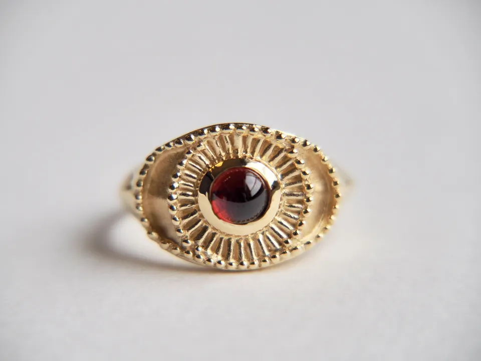 ・コンセプト 「心の内に秘めた光を引き出し、身に纏う人そのものを輝かせたい。」人は誰しも、心にきらりと輝く光を持っています。その光は、人それぞれに形が異なるからこそ美しく、素晴らしい。Rinnは、心に宿る光に寄り添うように、身につける人そのものを輝かせるジュエリーを提供しております。 「毎日身につけても壊れにくく、時を重ねるとともに肌に馴染んでいくようなジュエリーを」 Rinnは身につける人の肌と生活に馴染むジュエリーを提供しております。 ・デザイン 「他になく、永く愛されるデザインを。」 ジュエリーのデザインは、日常に溶け込んだささやかな美しさから生まれます。 例えば揺らめく布の柔らかさに触れた時や、朝陽が昇る瞬間に霞んでいたものが透き通って見えた時、感じ取った自然の美しさがジュエリーの形になっていきます。 そこへクラシカルな要素を取り入れることで、"Rinnにしかないデザイン"を意識いたしました。 お客様の生活に寄り添い続けるために、永く愛され続けるデザインにこだわりました。 そこには「親から子へと、時代を超えて受け継がれていって欲しい」という想いも込めております。どんな人にもどんな装いにも、しっくりと馴染み続けていくよう願いを込めてジュエリーを製作しております。 ・アイテム 天然石を中心置き、指輪の腕部分にまで精細な装飾を施した16世紀ごろのリングをモチーフにしたリングです。 ガーネットの赤とゴールドがゴージャスな印象です。