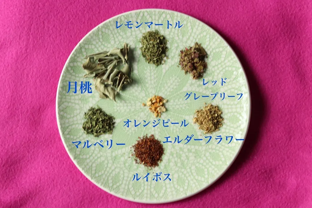 マルベリー(国産)・ルイボス・月桃・エルダーフラワー・レッドグレープリーフ・レモンマートル・オレンジピール
