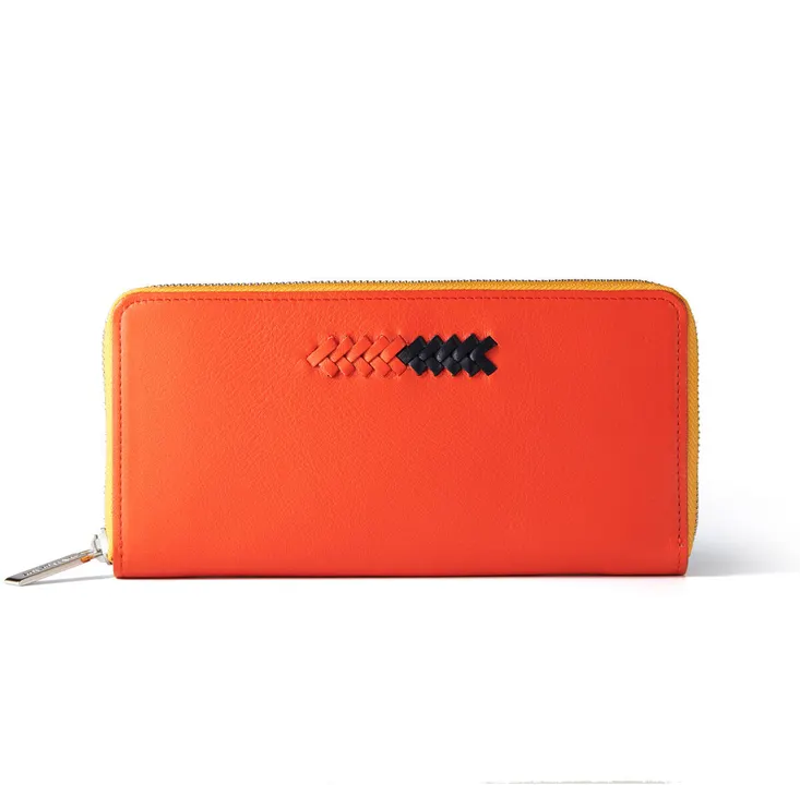 ーーーオリジナル編み込みモチーフが特徴のラウンド長財布 太陽に照らされた浅瀬の水面の反射を表現したモチーフがアクセントの大容量で使い勝手の良いラウンド長財布は、オレンジとネイビーブルーのSOLSOMAREらしいカラー配色が特徴です。 ユニセックスなデザインなので、性別や年代を問わずお使いいただけます。 ーーーお財布の機能について 小銭が見やすく取り出しやすいマチ付きの小銭入れが1か所、カードが12枚収納でフリーポケットを3つ装備、マチ付き札ポケット2か所と収納力抜群。フリーポケットの1つは小銭入れの横につきレシートなどを入れるのに便利な仕様になっています。 ーーー素材について 軽く手になじむ国産牛革スムースを使用。軽さとすべすべとした滑らかな手触りを感じながらお使い頂けるのが魅力です。経年変化は比較的にゆっくりなので、綺麗な状態で長くお使いいただけます。 外ファスナーと小銭入れのファスナーはYKKエクセラファスナーを使用しているので、動きも滑らか。 ーーーブランドBOX入りでギフトにも最適 いつも頑張っている自分へのご褒美として、または大切な方への贈り物としても。 商品は一つ一つブランドBOXにお入れいたします。 ーーアイテム詳細 [サイズ] H:97 W:197 D:21 [機能] カード×12 ファスナー付コインポケット×1 フリーポケット×3 札入れマチ付きポケット×2  ファスナー×2(YKKエクセラファスナー)  [カラー] オレンジ/ネイビーブルー ※掲載商品の色味は出来る限り実物の色味に近づけておりますが、ご利用のパソコン、スマートフォン、モニター環境によって、画像の色味が異なって見える場合がございます。予めご了承下さいませ。 [素材] 国産牛革スムース/ナイロン