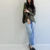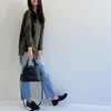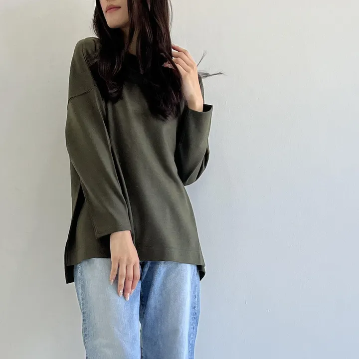 【日本製】ウォッシャブルウール_ボートネック スクエアシルエット裾スリットプルオーバー モスグリーン  1-2サイズ