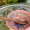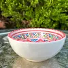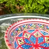 サイズ:約φ13×高さ5cm ※デザインは入荷時により多少異なることがございます。 チュニジアで陶器の町といえば「ナブール」 鮮やかな手つきでロクロを回し、その後で皿に絵付けをしている女性の手つきの見事さに感嘆。 たくさんある中でもよりすぐりの皿ばかりを選んでおります。 *「ナブール」は観光客だけでなく、チュニジア人でも陶器を買いに行くときは「ここ!」、というほど陶器の街として知られています。 この町の工場で職人が1点1点鮮やかな手つきでロクロを回し、皿に絵付けをしている女性の手つきの見事さに感嘆します。 中心から放射線状に広がる模様は、ほとんどの工房がこの柄で絵付けするほどオーソドックスです。 色鮮やかな文様は食べたあとでも食卓を華やかに演出してくれます。 *400年以上歴史のあるチュニジア伝統の絵付け陶器の街ナブールから、地中海の風をお届けします。 *ナブールは瀬戸市と姉妹都市です。