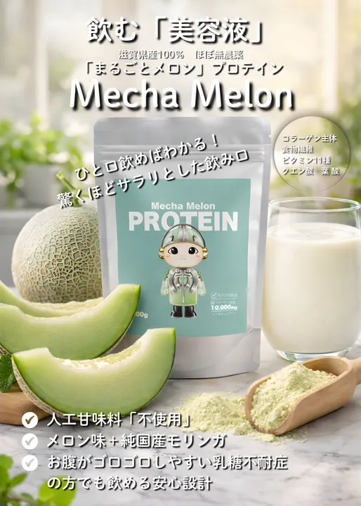 伊吹山系の雪解け水で育ったメロンを使用、皮や種まで丸ごと配合し栄養価を最大化。